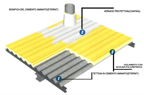 I manufatti contenenti amianto verranno trattati con una mano di poliuretano espanso a spruzzo dello spessore di 3 cm, impermeabile ed isolante termico che blocca la dispersione delle fibre tossiche, quindi bonificato ed innocuo anche senza smontare la struttura.
